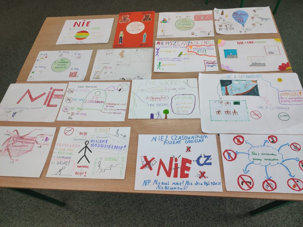 Uczniowie klas szóstych (6b, 6c) wykonali kolejne zadanie w ramach ogólnopolskiego projektu „Polak ma essę 2!”. Tym razem szóstoklasiści przygotowali plakaty ilustrujące poznane wcześniej zasady ortograficzne dotyczące pisowni wyrazów z „nie”. Powstały sortownie ortograficzne, a więc rysunki graficzne nazywane „rysnotkami”, które ukazały, że nauka ortografii może być … przyjemna dla wszystkich. Wprowadzając nowatorskie metody nauczania, sprawiamy, że uczniowie lepiej przyswajają wiedzę, nabywają nowe umiejętności (zawsze przydatne w przypadku nauki ortografii), a stwarzając warunki do rozwijania kreatywności i twórczej aktywności uczniów, angażujemy nawet tych, którym ortografia spędza sen z powiek. Nieprawdaż?