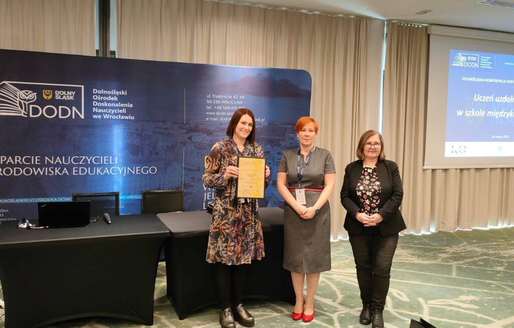 26 marca br. podczas dolnośląskiej konferencji z zakresu wspierania uzdolnień nasza szkoła otrzymała Certyfikat Szkoły Wspierającej Uzdolnienia za lata 2019-2024. Wicedyrektor szkoły – p. Iwona Smolińska wraz z p. Elżbietą Chilińską uczestniczyły w konferencji „Uczeń uzdolniony w międzykulturowej szkole”, która odbyła się we Wrocławiu. Podczas uroczystej gali 18 szkołom wręczono prestiżowy certyfikat, który jest dowodem uznania minionych działań każdej ze szkół. Należy podkreślić, że lubańska Jedynka otrzymała 100% punktów za przygotowane sprawozdanie, przedstawienie programu na kolejne lata oraz prezentację. Przedstawione działania, różnorodne formy pracy z dziećmi i sukcesy naszej szkoły wzbudziły zainteresowanie odbiorców. Otrzymane wyróżnienie jest dla nas ogromną motywacją do dalszych twórczych działań w rozwijaniu zainteresowań i wspieraniu uzdolnień naszych uczniów. Cieszymy się, że inicjatywy podejmowane w związku z realizacją Szkolnego Programu Rozwijania Zainteresowań i Wspierania Uzdolnień zostały wysoko ocenione przez Komisję Akredytacyjną i przyniosły naszej szkole uznanie. Na ten sukces zapracowali wszyscy – uczniowie, rodzice oraz nauczyciele, więc gratulacje należą się wszystkim!