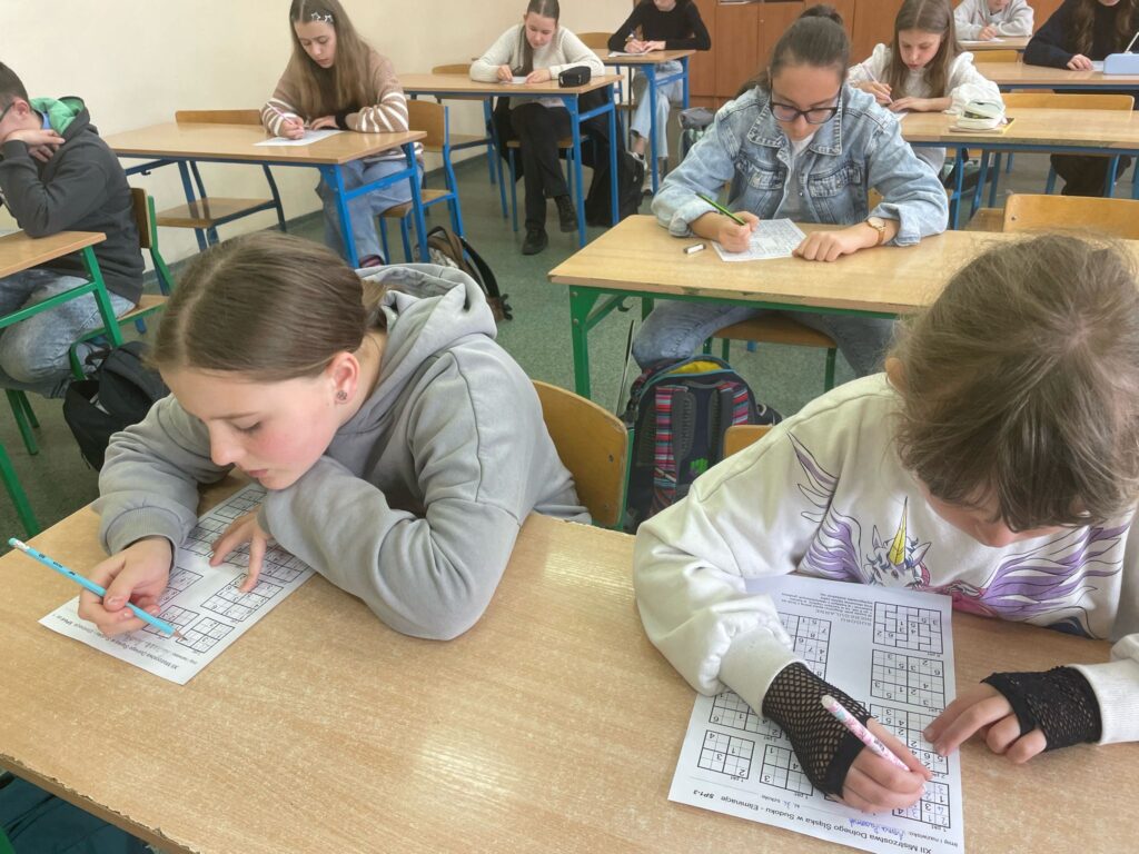 Dnia 8 kwietnia w lubańskiej Jedynce odbył się szkolny etap XII Mistrzostw Dolnego Śląska w SUDOKU, którego organizatorem jest Politechnika Wrocławska. W tegorocznych zmaganiach wzięło udział 14 uczniów z klas 1-8, którzy rywalizowali w trzech kategoriach wiekowych (kl. 1-3, 4-6, 7-8). Uczestnicy zmierzyli się z wymagającymi łamigłówkami, które sprawdzały ich logiczne myślenie, spostrzegawczość oraz koncentrację. Atmosfera była pełna skupienia, ale też zdrowej rywalizacji i dobrej zabawy. Gratulujemy wszystkim uczestnikom zaangażowania i odwagi w podjęciu sudoku – wyzwania! Trzymamy kciuki za tych, którym uda się zakwalifikować do kolejnego etapu. Wyniki poznamy do końca kwietnia 2025 r.