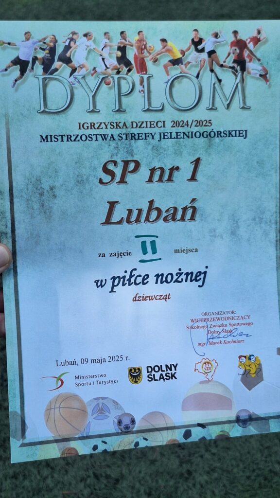 W piątek 9 maja, w naszej szkole, odbył się finał strefy jeleniogórskiej w piłce nożnej dziewcząt I-VI – w kategorii Igrzysk Dzieci. W zawodach uczestniczyły reprezentacje trzech placówek: SP Lubomierz, SP Nowa Wieś i SP1 Lubań. Nasze, młode piłkarki walczyły bardzo dzielnie i ostatecznie zajęły wyśmienite 2. miejsce, zdobywając tytuł wicemistrzyń strefy jeleniogórskiej! Dziewczęta, serdecznie gratulujemy uzyskanego wyniku i dziękujemy za niezwykłą waleczność na boisku! Wyniki meczów naszej reprezentacji. SP1 Lubań – SP Nowa Wieś 2:1, SP1 Lubań – SP Lubomierz 0:2.