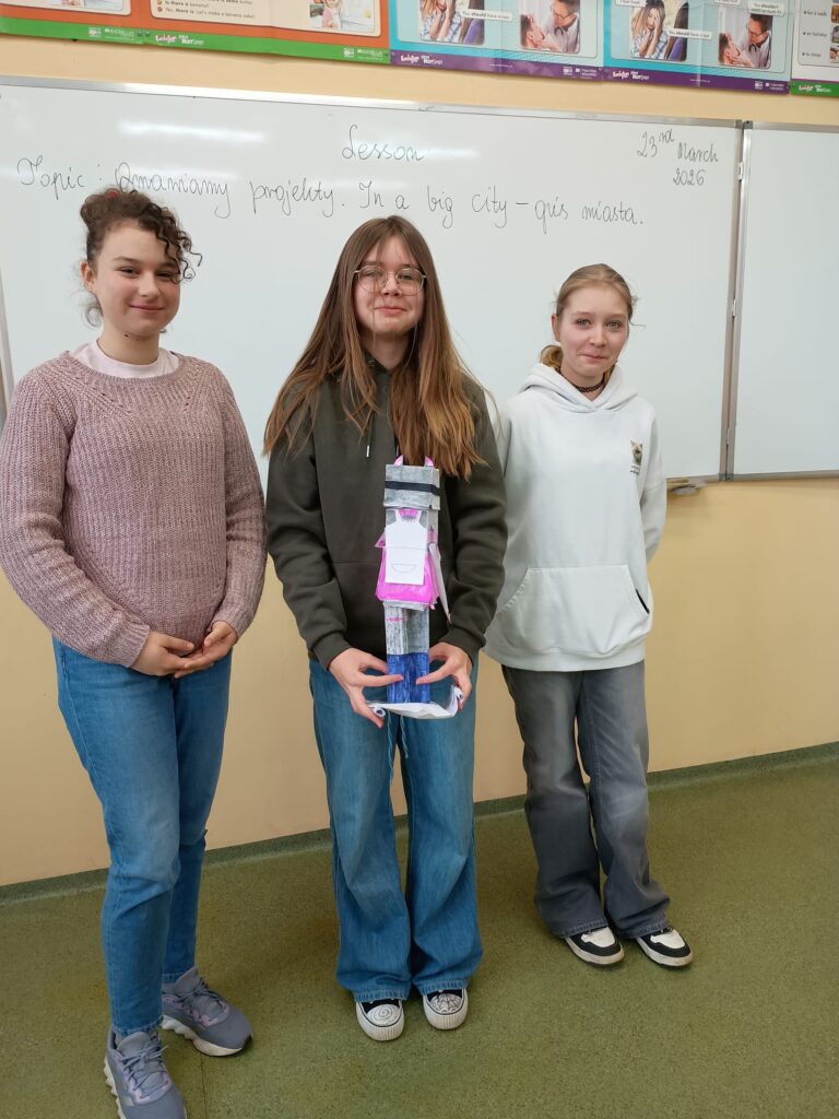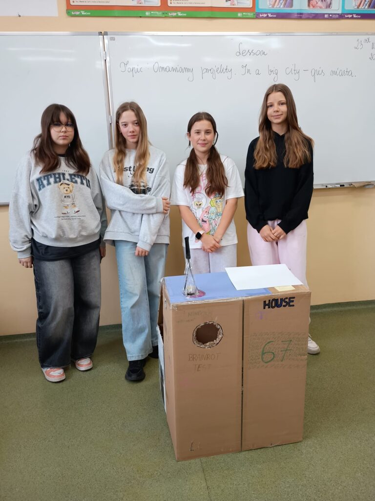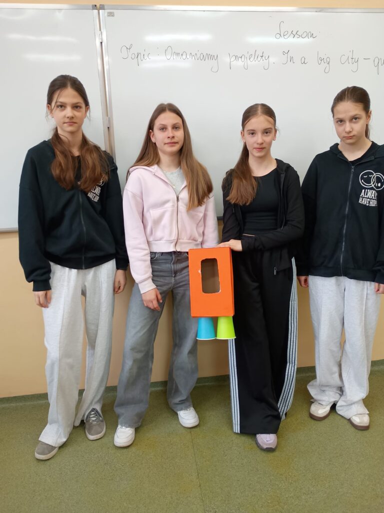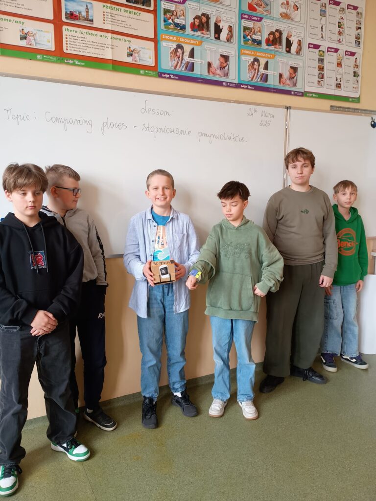 Po przygotowaniu swoich wynalazków uczniowie mieli za zadanie opisać je w języku angielskim. Dzięki temu mogli nie tylko rozwijać kreatywność, ale także ćwiczyć słownictwo i umiejętność wypowiadania się w obcym języku.